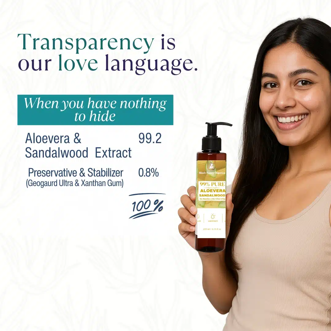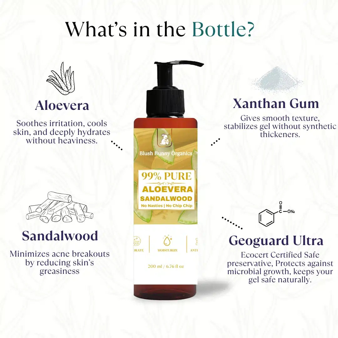 I have tried many brands alovera gel but everyone has xanthan gum used as a thickner and many other unnecessary ingredients which is not required and a lot of artificial fragnance and colour added in it . Then I found Blush bunny organics Alovera gel i was surprised to see it has only two ingredients 99% Alovera and 1% natural preservative that's it 🤌🏻. Finally my search ended here I have almost finished 10 bottles of it I use it as a hair serum by mixing with some of any oil , as a pimple overnight remover, mosturiser, in diy masks etc. and it works amazing I have tried every variant orginal one, rose water one but the sandalwood feels so much soothing and relaxing on my face I put it in fridge for extra cooling effect . I almost finished the bottles now I have to cut it with a knife to take out rest left because it's not pumping out 😅. Thanku you Blush Bunny for this amazing product 🫶🏻💗